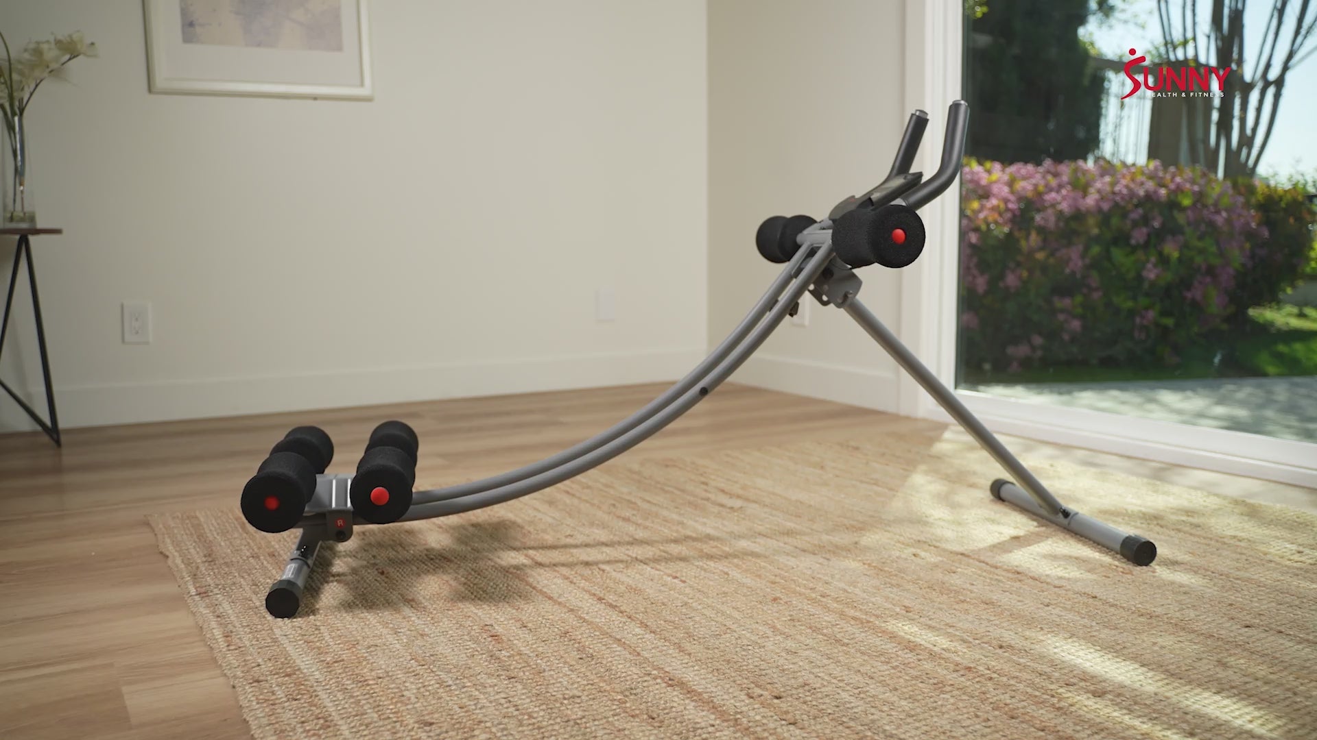 The Sunny Health & Fitness Core Glider Ab Trainer Machine is ergonomically designed to engage multiple muscle groups, helping you sculpt and strengthen your core, waist, and body. With a sturdy steel frame supporting up to 220 lbs, this ab trainer is built for durability during intense workouts. Two adjustable slope settings allow you to modify the intensity of your core and ab exercises by simply repositioning the sliding tube pin, offering a customizable challenge. Thick, supportive foam rollers provide comfort and maintain a solid grip and position as you crunch and glide. Contoured slip-resistant handlebars ensure a firm grip for maximum leverage while targeting abs, obliques, glutes, and hamstrings. A digital monitor tracks calories, count, time, total count, and includes a scan mode to monitor progress. The included device holder secures your smartphone or tablet, allowing you to follow along with workouts on the free SunnyFit App, which offers over 1000 training videos. Rubber end caps prevent floor scuffing and enhance stability. With a compact, foldable design (9.84 inches high when folded), this trainer is easy to store under a bed or in a closet, making it ideal for home gyms. Assembly is simple with included tools and step-by-step instructions.