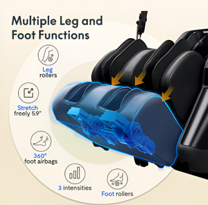 Dual foot rollers + extended calf airbags for 360° leg massage.