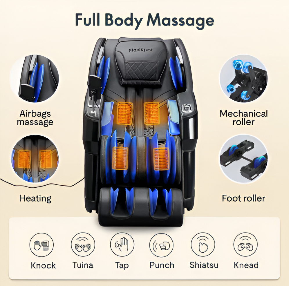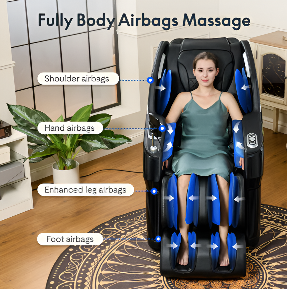Foot Rollers and Airbags: Stimulate pressure points in your feet and calves with dedicated foot rollers and airbags, enhancing the massage experience.