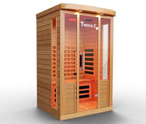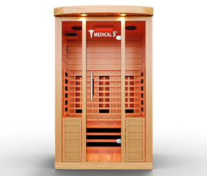 The Medical 5 Infrared Sauna, designed for 3 persons, is a doctor-engineered wellness solution crafted to enhance health through advanced heat therapy. Constructed with natural hemlock wood, known for its durability and astringent properties, this sauna hardens over time, ensuring longevity beyond 10 years. The Rapid Internal Heating System allows the sauna to reach optimal temperatures in just 40 minutes, significantly faster than traditional saunas that take 90 minutes to 2 hours, maximizing your time for relaxation and healing. With a maximum temperature of 140°F, the infrared technology enables extended sessions of up to an hour, promoting profuse sweating for detoxification. The sauna features 3D Heat Therapy to improve muscle recovery, increase range of motion, and reduce pain, alongside a Skin Rejuvenation/Cleansing System that leaves skin feeling refreshed. Designed and hand-assembled in the USA, it incorporates full-spectrum infrared technology (near, mid, and far) to target every part of the body, supporting cardiovascular health, immune system strength, and pain relief. The spacious interior accommodates multiple users comfortably, making it ideal for home use. Easy to install with a 3-year parts warranty, this sauna is backed by documented research for benefits like improved blood flow, reduced headaches, and better sleep.