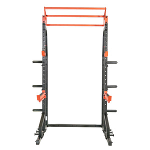 Crafted from premium 2” x 2” high-strength steel and rated for up to 805 lbs, this half rack includes adjustable spotter arms, J-hooks, and a multi-grip pull-up bar—making it perfect for lifters of all levels.