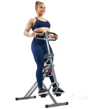 The Sunny Health & Fitness Row-N-Ride PRO Smart Squat Assist Trainer transforms your fitness routine with a space-efficient design for effective full-body workouts. This innovative machine promotes compound movements, engaging multiple muscle groups like glutes, quads, thighs, abdomen, obliques, arms, and chest to burn calories efficiently. Featuring 12 levels of adjustable hydraulic resistance, it allows you to customize workout intensity, starting at 38 lbs and reaching up to 202 lbs. The durable steel frame supports users up to 300 lbs, ensuring stability during rigorous sessions. Adjustable squat settings at 30°, 60°, and 90° enable personalized depth and intensity. The ergonomic curved handlebar with four length settings and a padded seat provide comfort for users of all sizes. Non-slip foot pedals mimic ground squats to maintain proper form, while optional resistance bands add variety to exercises like rows and presses. A digital monitor tracks time, reps/min, count, and calories burned, and Bluetooth connectivity syncs with the free SunnyFit App for access to over 1000 workouts and 10,000+ global routes. The foldable design (62.25L x 19H inches when folded) ensures easy storage, making it ideal for home gyms. Assembly is straightforward with included tools and an online guide.