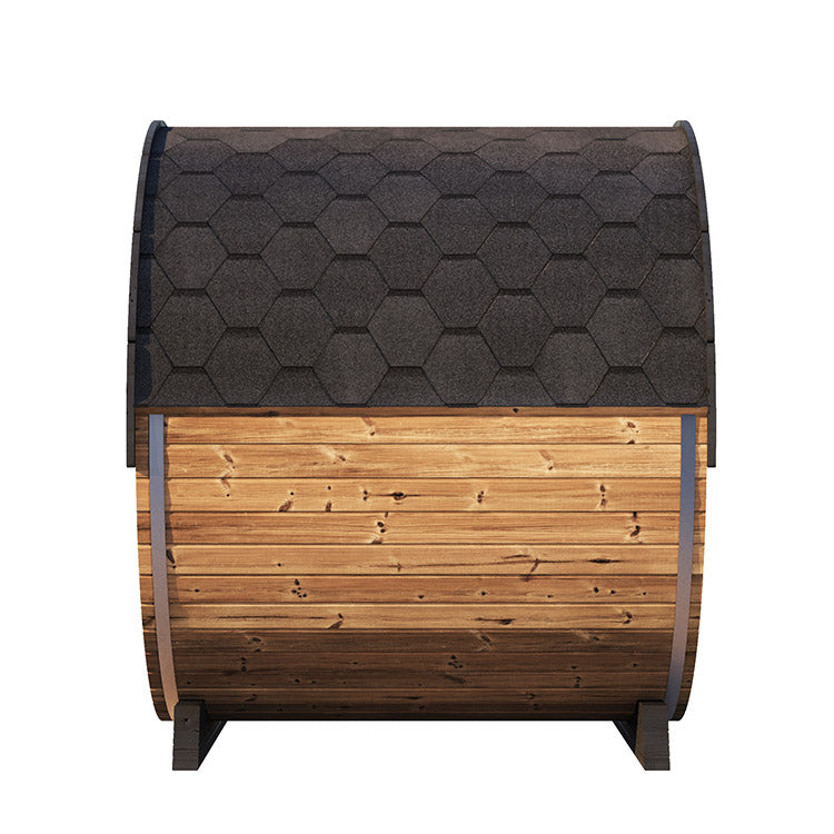 Constructed from 1.65” thick full-length Thermo-Spruce staves, the EE8G is naturally treated with heat and steam for 2x the lifespan of traditional cedar. This eco-friendly, chemical-free material delivers exceptional strength, thermal efficiency, and resistance to rot and warping. Stainless-steel barrel bands and a watertight black shingle roof kit ensure maximum weather protection, while dual floor drains manage moisture effectively.