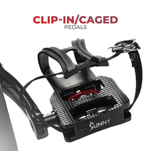 Dual clip-in/caged pedals for stability and power transfer