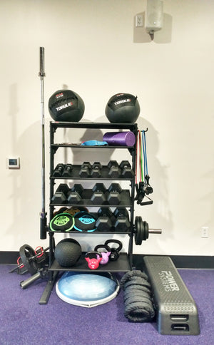 THE HUB250 provides a huge amount of storage in a small footprint only 25” wide. Designed as a replacement for numerous single product racks, it can be configured to store a wide variety of accessories. Position the 3 large shelves to fit the accessories in your room. With four frame uprights, you get lots of space to add accessory attachments. Add training attachments such as a landmine and/or battle rope to create a functional training system. PERFECT HOME GYM OR FOR PERSONAL TRAINING AND SMALL GROUP TRAINING ACCESSORIES. Stores a broad variety of accessories efficiently.