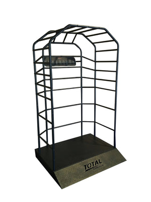 The Motive Fitness TotalStretch Platform is designed for heavy-duty commercial & residential use, offering a versatile solution for safe and effective full-body stretching in fitness facilities, physical therapy clinics, and home gyms. This robust platform features a solid, heavy-duty diamond-plate base that ensures stability and provides a safe foot grip for users. The ramp wedge facilitates easy access to the platform and doubles as a dedicated calf stretching station . With multiple grip positions, the TotalStretch allows users to target various muscle groups and joints, supporting a wide range of stretches to improve flexibility, enhance athletic performance, and aid in injury prevention. The included placard guides users through a circuit of main stretches, targeting key muscle groups for a comprehensive stretching routine. Constructed with strong gauge steel and coated in a black protective finish, the TotalStretch is built to withstand moisture, scratches, and general wear, ensuring long-term durability. The platform is easy to assemble and includes wheels for convenient mobility. With dimensions 50 inches long, 41 inches wide, and 86 inches high, and a weight of approximately 285 pounds, the TotalStretch is both sturdy and manageable for commercial and residential environments.