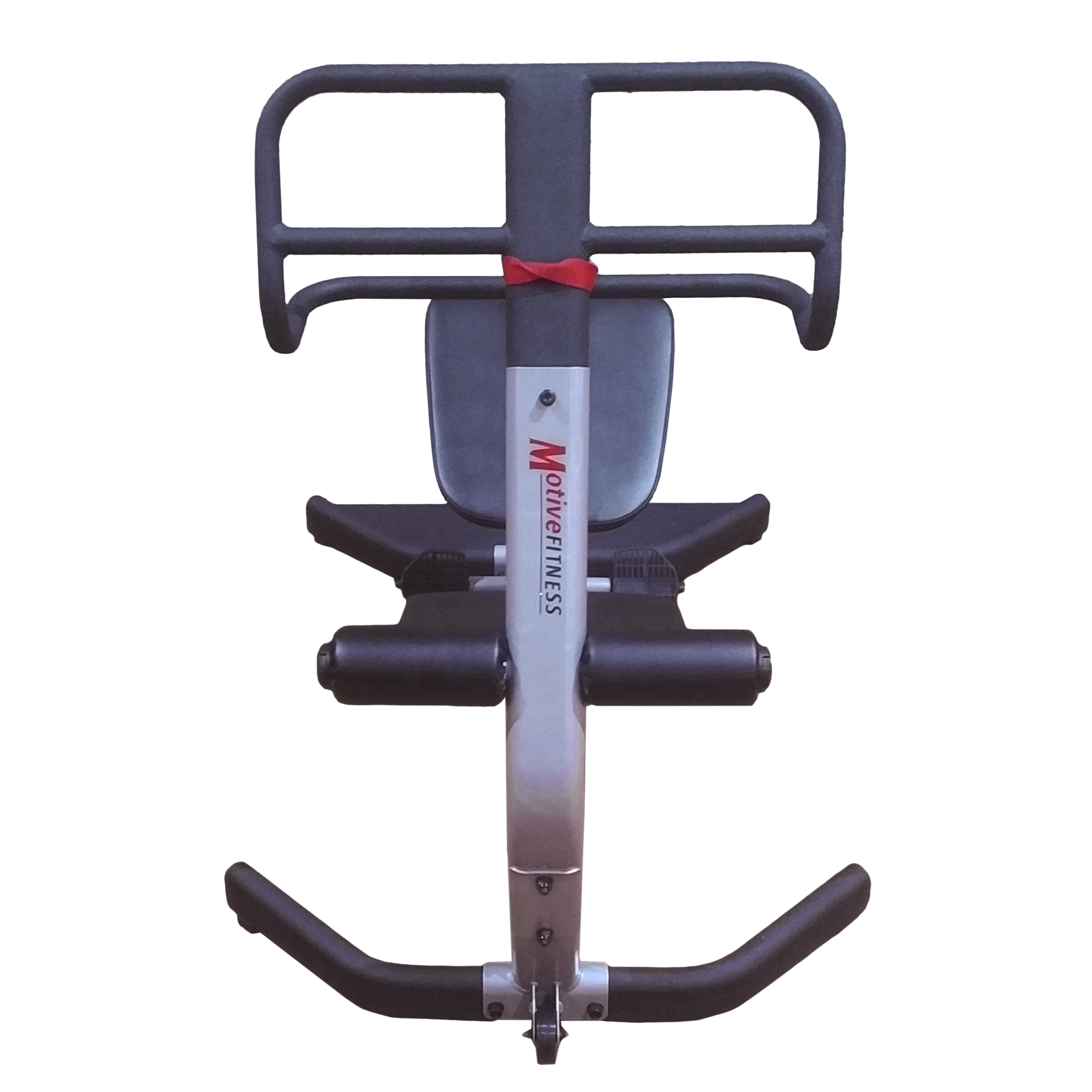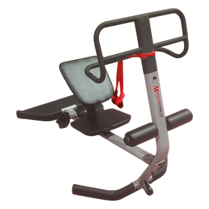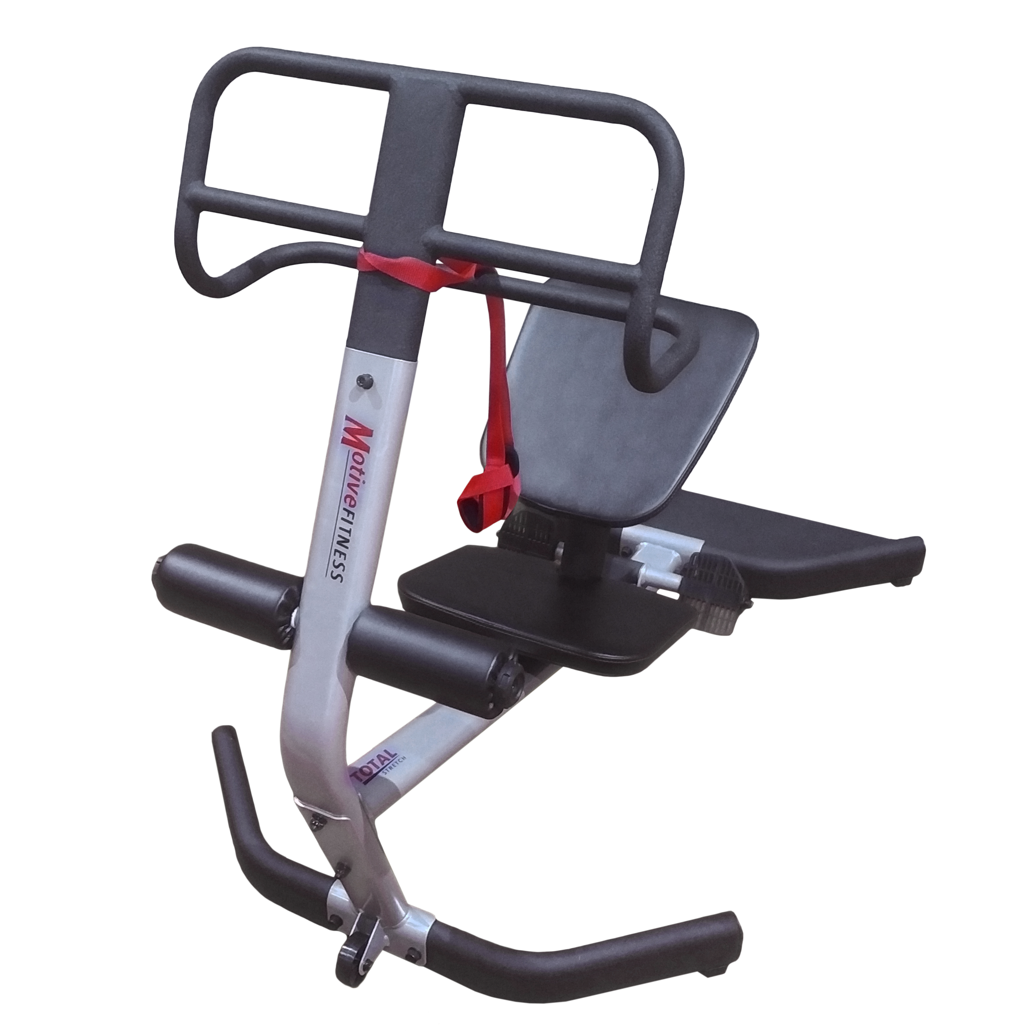 The Motive Fitness TotalStretch TS150 is a commercial-grade stretching machine designed for fitness facilities and home gyms, offering a slightly lighter frame than the TS200 while retaining its core features. It enables users to perform a comprehensive set of stretches safely and effectively, targeting multiple muscle groups in one compact unit. Whether seated or standing, from the front or back, the TS150 supports stretches to improve flexibility, enhance athletic performance, prevent injuries, and relieve back pain. The ErgoStretch handlebar system provides multiple grip points to accommodate users of all sizes, ensuring a biomechanically correct angle for effective hamstring and lower body stretches. The ErgoStretch platform stabilizes users for precise lower leg stretches, while the ErgoStretch rollers offer comfortable leg stabilization for both seated and standing positions. A padded seat and leg pad ensure comfort and proper positioning during seated stretches. The included placard guides users through an 8-stretch total body circuit, simplifying the stretching routine. Built with a sturdy steel frame and a single-wheel design for easy mobility, the TS150 weighs 64 pounds and measures 55 inches long, 33 inches wide, and 43 inches high. Assembly takes approximately 45 minutes, making it a practical addition to any fitness space.