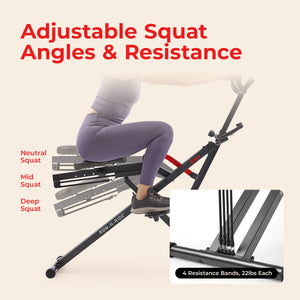 Customize your workouts with 3 squat depth angles (30°, 60°, 90°) for shallow to deep squats, 5 adjustable resistance levels via 4 heavy-duty elastic bands (each rated at 22 lbs), and ergonomic adjustments including a multi-position handlebar (up/down and 4 length settings) plus a forward/back adjustable padded seat (11.8" x 7.4") with multiple height options (16.6" to 25.2" from ground) for a perfect fit across various body sizes. Self-leveling pedals ensure proper form and stability, while the built-in LCD monitor tracks time, reps per minute, total count, calories burned, and scan mode—plus a convenient device holder for following workouts.