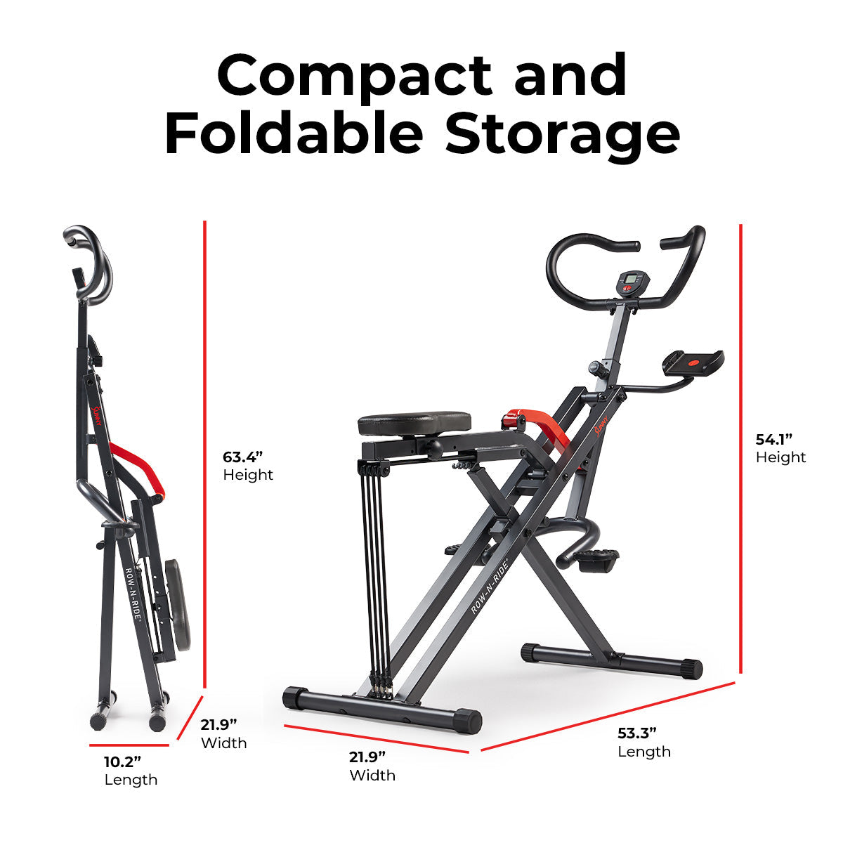 Space-saving and portable, this foldable squat trainer collapses to compact dimensions (10.2"L x 21.9"W x 63.4"H) for easy upright storage in small homes, apartments, or offices, with minimal assembly required and a lightweight 39.2 lb build. Assembled dimensions: 53.3"L x 21.9"W x 54.1"H. Backed by Sunny Health & Fitness's commitment to quality since 2002, including a 1-year structural frame warranty and 180-day parts warranty, the Upright Row-N-Ride Plus is your reliable, versatile solution for effective, joint-friendly home strength and cardio training that fits any busy lifestyle.